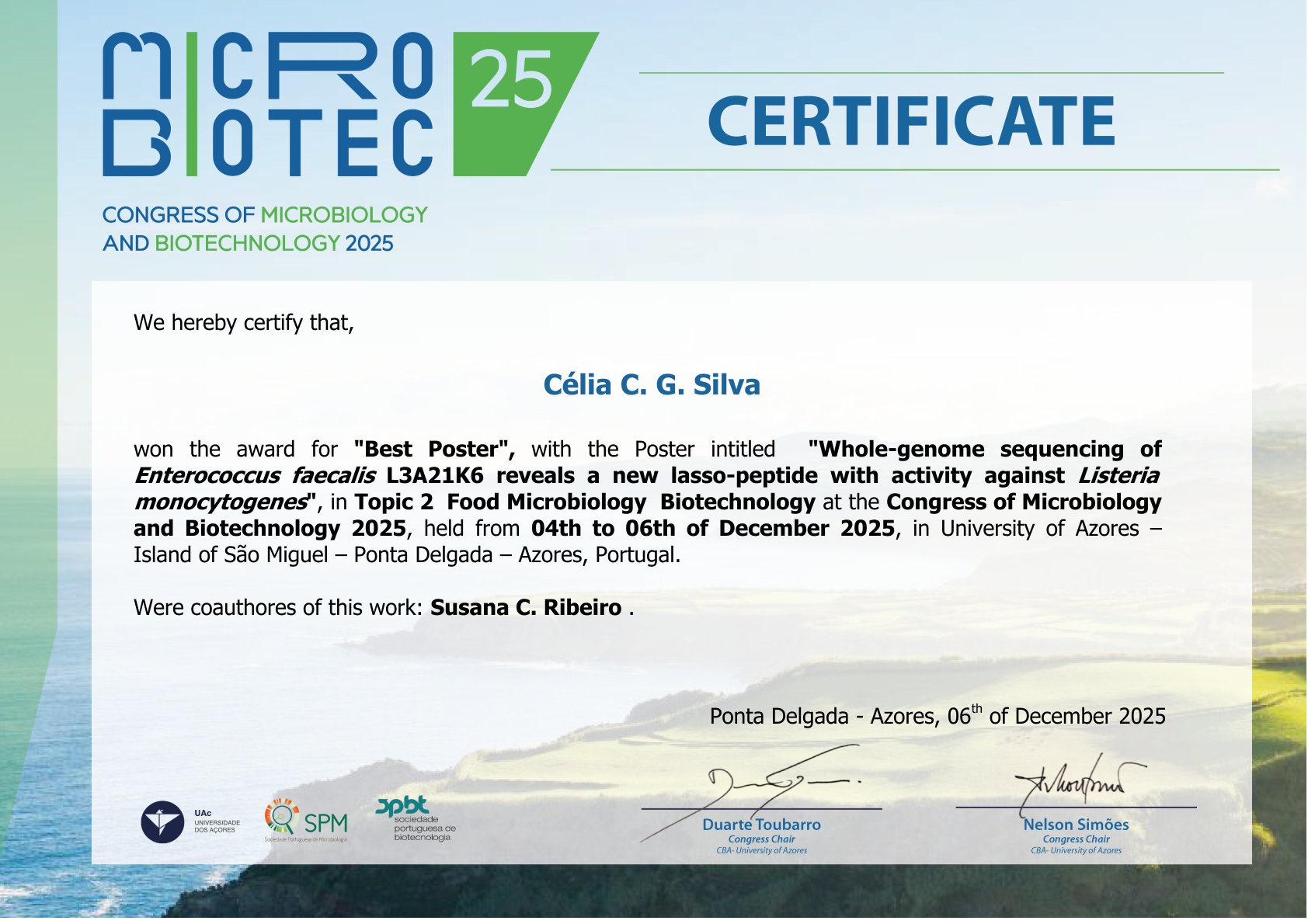 Investigadores do IITAA receberam o prémio de "Melhor Póster", com o póster intitulado "Whole-genome sequencing of Enterococcus faecalis L3A21K6 reveals a new lasso-peptide with activity against Listeria monocytogenes", no Tópico 2 – Microbiologia de Alimentos e Biotecnologia no Congresso de Microbiologia e Biotecnologia – Microbiotec25, realizado de 4 a 6 de dezembro de 2025, na Universidade dos Açores – Ilha de São Miguel – Ponta Delgada – Açores, Portugal.