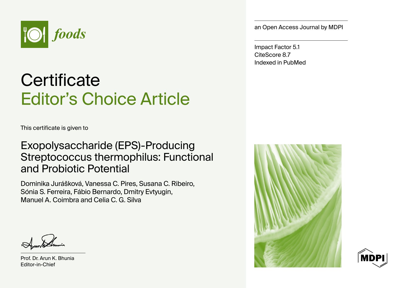 No passado dia 8 de janeiro de 2022, foi publicado na revista Foods, o artigo "Exopolysaccharides Produced by Lactic Acid Bacteria: From Biosynthesis to Health-Promoting Properties", da autoria das Sras. Professoras e Investigadoras Célia Silva, Susana Ribeiro e Dominika Jurásková. Este artigo recebeu o prémio de melhor artigo da revista, foi um de entre 4 artigos (um dos 2 artigos de revisão premiados) considerados os melhores de um total de 4520 artigos publicados em 2023 (24 volumes).